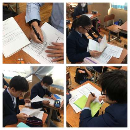 学習協力委員の合図の元、各クラス、今日の授業の中で一番しっかり書けたと思う教科のノートを検定し合っています。