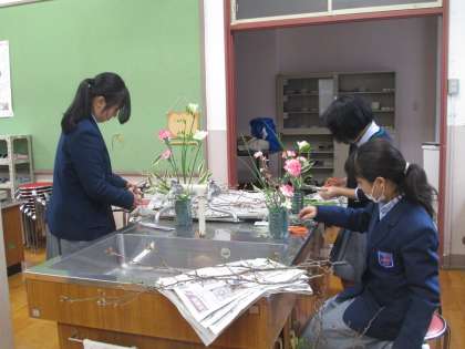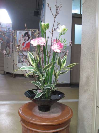 一番右にあるのは、先生がデモンストレーションに生けて下さった作品です。早速玄関に飾りました。卒業式にご来賓が来られるので、玄関に華やぎを添えてくれるといいな、と思っています。