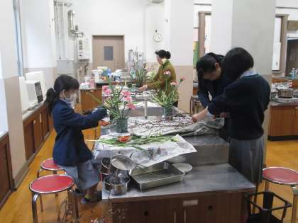文化部・女子チームは、今年度最後の華道のお稽古をしました。今日の花材は、桜・カーネーション・フリージア・サンデリアナの4種類でした。