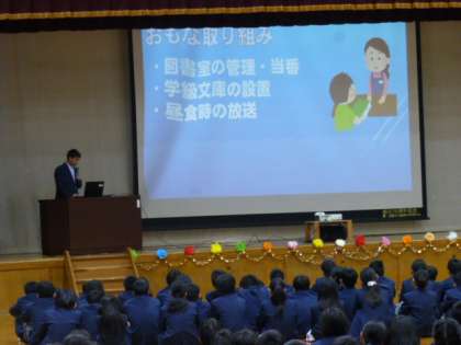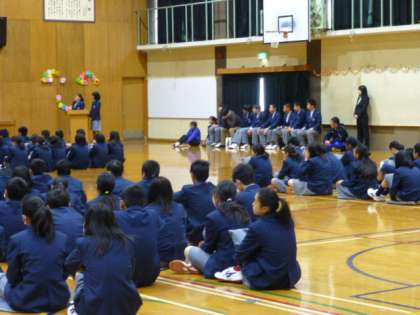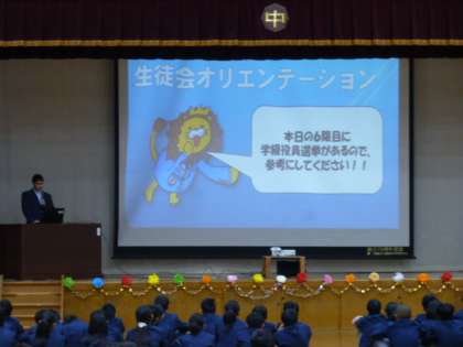歓迎会のあとは、生徒会オリエンテーションです。生徒会本部のみんなから、本部や各委員会の活動内容などの説明がありました。みんなしっかり聞けていましたね。ぜひ、このあとにある学級役員決めでは、積極的に立候補して、生徒会の活動に大いに参加しましょう!
