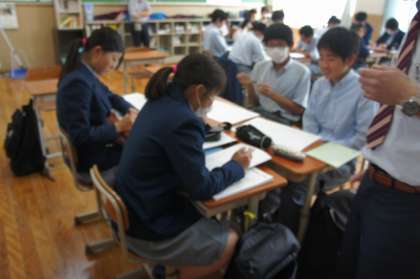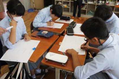 数学は、展開と因数分解をグループで教え合いながら総復習をしています。