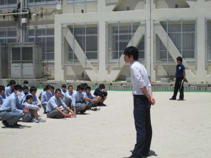まずは、委員長から「ごみゼロの日」の意義説明を受け、生徒指導部長の先生から地域に出ていくにあたっての注意を受けました。