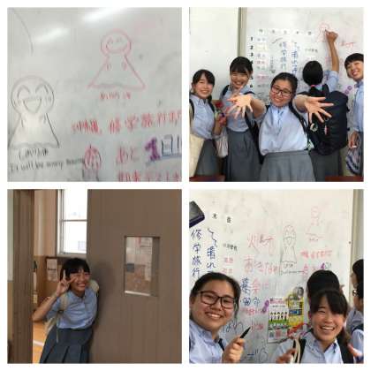 雨が降らないように、放課後2組の教室では、たくさんのテルテル坊主を描いていました。当初は「雷雨」?!の予報でしたが、どうやら「晴れ」のよう!!