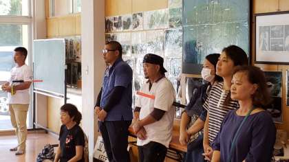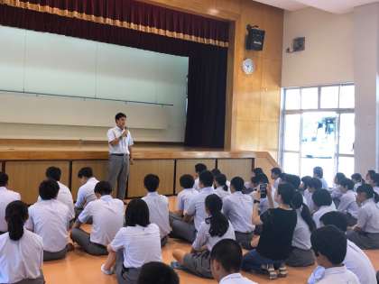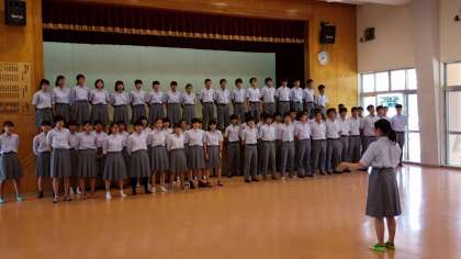 公民館に集合し、離村式を行いました。まずは民家代表の方からお言葉をいただきました。生徒が夕食の際などにお手伝いをしていたことなどを褒めてくださいました。そして、友禅染のお土産も喜んでおられました。それから、民泊先の方々に、生徒会長からお礼を伝えました。「3日間の貴重な体験を京都に持ち帰り、身近なところに発信していきます!」と、話してくれました。最後に「ふるさと」をみんなで合唱しました。民泊先の方も教職員も感動する、素敵な歌でした。