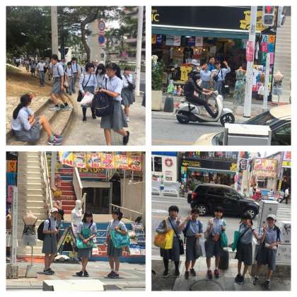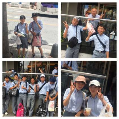 国際通りでの班別研修の様子です。皆お目当ての店に行ったり、お土産をたくさん買い込んでいます!!