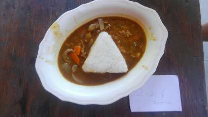 左から、3組3班の「日の丸カレー」、2組4班の「おにぎりカレー」、2組3班の「ミッキーカレー」です。
