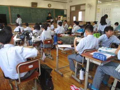 クラスメイト同士で実施する検定、さて、ノートの様子はいかがでしょうか。班で机をくっつけて、厳しい(?)指摘をしている場面もあれば、“あれ?まだ始まっていないの?急いでや…”というような場面も。