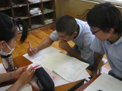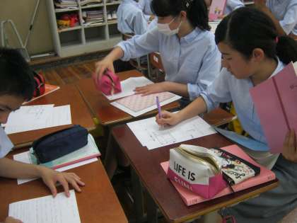 学習協力委員長の放送とともに、2回目のぷちあと検定が実施されました。班長が班員のノートを吟味してくれています!来週はあしあと検定が実施されます。