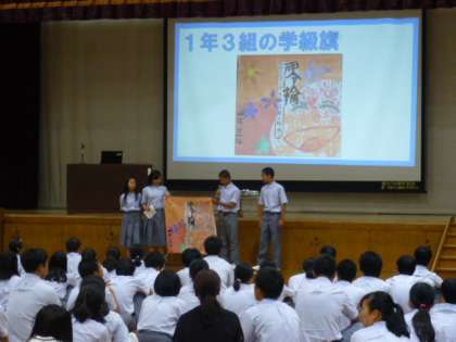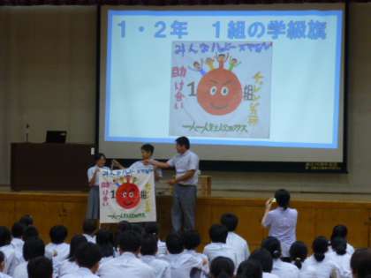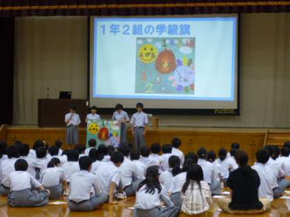 そのあとは各学級の紹介です。各クラスで制作した学級旗を手に、学級目標を説明し、旗や目標に込められた思いやどんな学級にしていきたいのか等、発表してくれました。