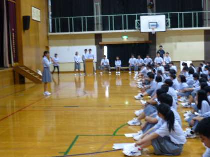 副会長のあいさつで、前期生徒総会が無事、終了しました。生徒会本部の皆さん、議長を務めた二人、各部のキャプテン、各学級代表の皆さん、本当にお疲れ様。フロアで聞く側の態度もたいへんよかったですね。すばらしい生徒総会でした。