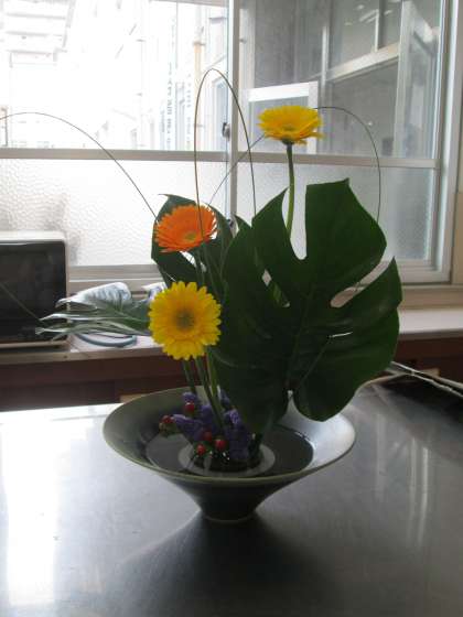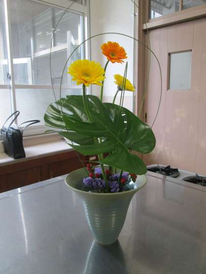 「面を生かした生け方」ということで、モンステラという大きな葉っぱを生かして、面と曲線とを織り交ぜたような生け方をしました。スチールグラスという材料が、とてもまっすぐ伸びている植物で、それをどのように曲線にするか、なかなかセンスが必要でした。いかがでしょうか?