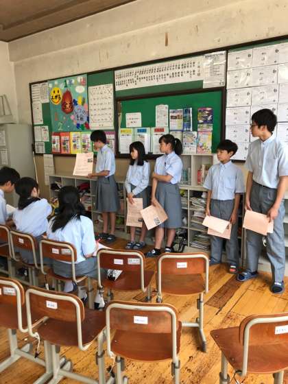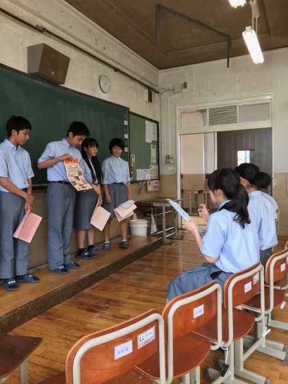 ポスターセッション形式で2年生の職場体験の発表を聞いています。初めはお互いに緊張気味でしたが,回数を重ねるごとに質問も応答もスムーズにできてきました。
