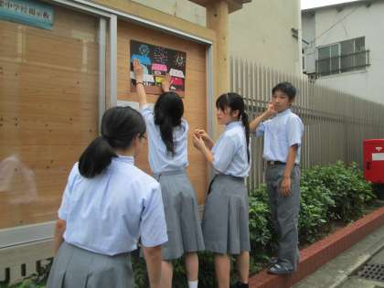文化部美術コースでは、不定期ですが校門横掲示板の飾りつけをしています。ずっと6月の飾りのままだったのですが、今日ようやく7・8月ver.に更新できました。