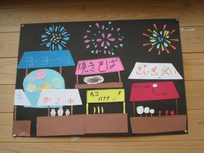 今回は、夏祭りをイメージした飾りにしました。花火は、色画用紙の端切れを利用して、夜空に開いているような感じにしました。また、祭りらしく屋台も出ています。