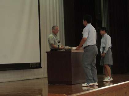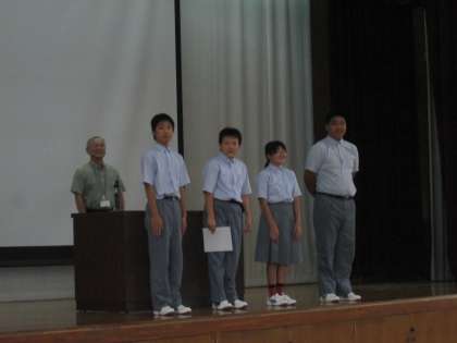 まず、陸上競技部の3年生2人は、京都市中学校夏季選手権大会・全日本中学校通信陸上競技大会京都大会で、それぞれ優秀な成績を収めました。1組の生徒たちは、全市育成学級合同球技大会で優勝しました。また、「社会を明るくする運動」の標語作りについて、2名の生徒の作品が優秀であるということで、表彰されました。頑張りました!
