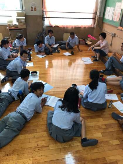 1年生,舞台発表に向けての取り組みがいよいよ始まりました。1・2・3組を合体させて4つのグループに分かれての取り組みとなります。どのグループもクラスを越えて協力し,いろいろなアイデアを出し合っています。話合いのスタイルもさまざま。。。