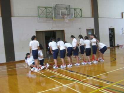 むかで競争の練習の様子です。学年体育で全クラスで練習をしています。お互いの指示がとびかいます。