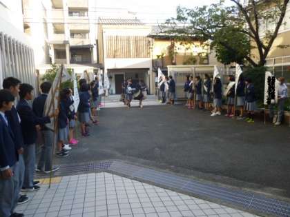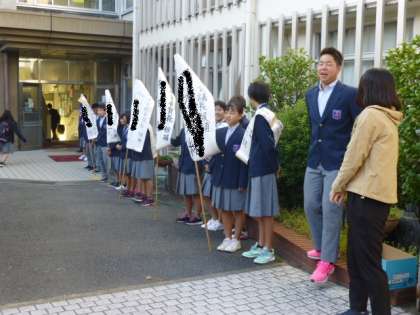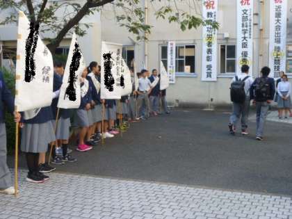 今朝から、生徒会本部役員選挙に向けてのあいさつ運動が始まりました。選挙管理委員会の声掛けで、立候補者及び応援演説者が正門前に集まりました。立候補者は、登校してくる生徒の皆さんに、大きな声で「おはようございます!よろしくお願いします!」と呼びかけていました。