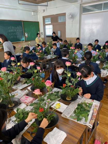 生け花にチャレンジしています。花器や剣山,いろいろな用具の使い方やアドバイスをいただきながらお花を生けています。みんな,真剣にお花と向き合っています。「どんな風に生けようかな。」「うまくいかないな。」試行錯誤しながらも楽しいひと時となりました。