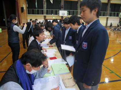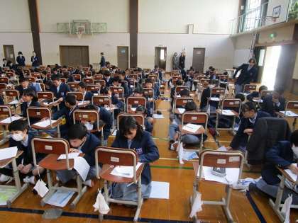ノート検定は,生徒と先生がノートについて意見交換をしながら評価をしてもらいます。検定を待っている生徒は確認テストの勉強です。