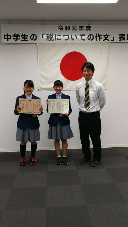 夏休みの宿題で「税の作文」に取り組み,応募したところ、3年生2名が 京都府納税貯蓄組合総連合会会長賞と近畿税理士会上京支部長賞をいただきました。そして昨日、その2名の受賞者が表彰式に出席しました。     そこで、賞状と記念品が授与されました。おめでとうございます。私たちが住みやすい街をつくるために、税は大きな役割を果たしています。作文を書くにあたって勉強したことを、これからにいかしていきましょう。