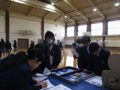 各ブースをたずねていき、学習を深めている様子です。実際に手にとったり、標本を見たり、測定したりしました。クイズに解いています。