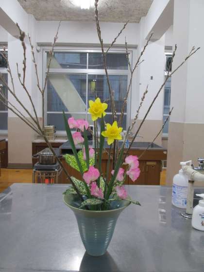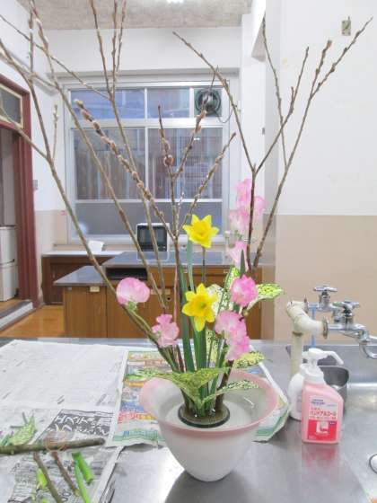ただ、色合いとか花材として可愛い雰囲気なのですが、ネコヤナギが思ったように切れなくて、苦戦しました。毎回、何かに苦戦しています。ネコヤナギの枝ぶりが良すぎて、お花のはさみでなかなか切れません。いろいろ工夫して、何とか切りました。