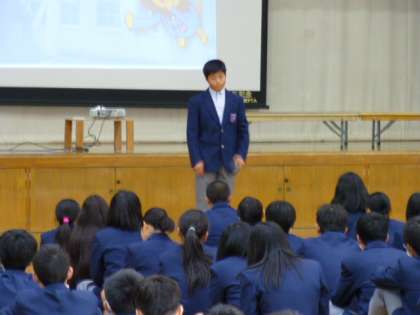 会の初めは、生徒会長のあいさつです。司会・進行も生徒会本部が担当します!あいさつのあと、一人一人、本部役員を紹介しました!