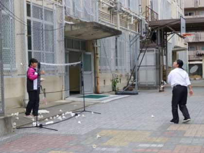 体育館外ではバドミントン部が練習に取り組んでいました。2人での練習ですが、しっかりと声を掛け合いながら、息ピッタリでした。