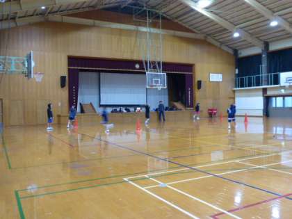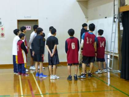 体育館内では、男女のバスケットボール部が活動!女子はシュート練習、男子は顧問の先生の指示をしっかりと聞いている場面でした。