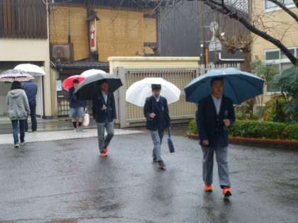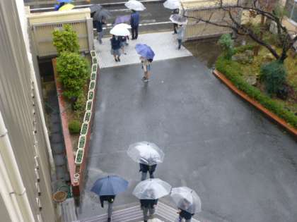 傘をさしての登校ですが、足元がけっこうずぶ濡れで・・。