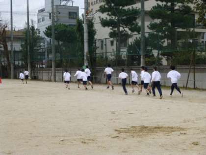 1−2は体育で、持久走です。強風の中、みんな一生懸命に走っています!