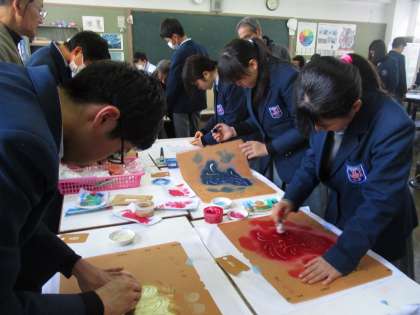 友禅染の起こりと、友禅染の手順や本日の作業について説明を聞きましたが、スタートすると、加減がなかなか難しく、力が入っていますね。職人の方々、タイミングよくおしえてくださりありがとうございました。それぞれの個性の出る作品に仕上がりました。