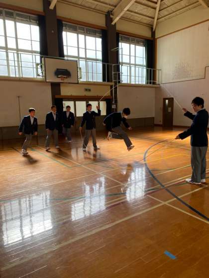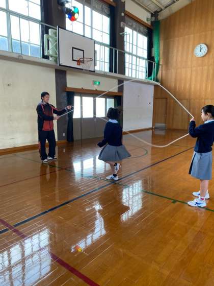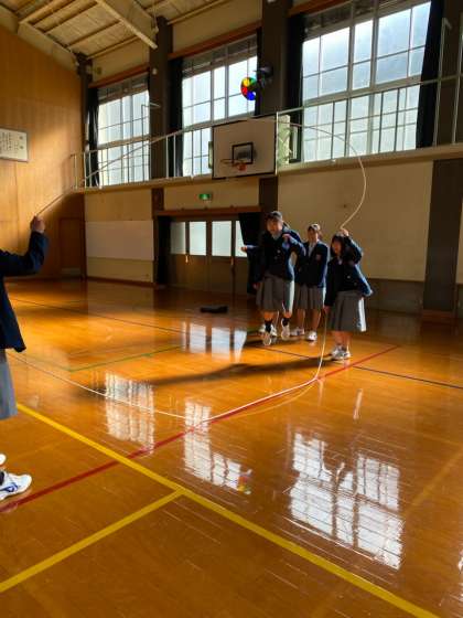 1年生は今,体育の授業でダブルダッチに取り組んでいます。お昼休みには体育館で練習する人がたくさんいました。まわし手も跳び手も難しそうですが,さすがですね!昼休みの終わりの方にはうまくなってきていました。寒いなかですが,みんなで盛り上がって,心も体も暖まりましたね!