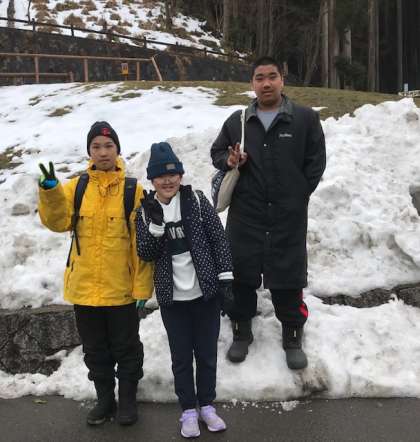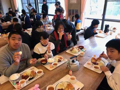 花背山の家2日目。たくさん朝ごはんを食べ、雪遊びに向かいます。雪が少なくソリ遊びは出来ず残念ですが、山の家最後の1日楽しんできます。