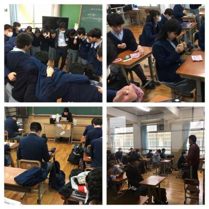 3年生は4限昼食後に、各クラスの終学活で私学前日のときのように、担任の先生やクラスメイトからの激励メッセージやグッズをもらい、円陣を組んだりして、受検に向けて