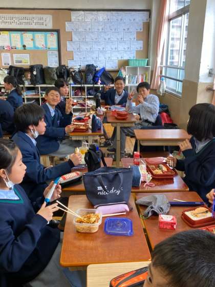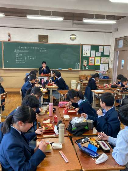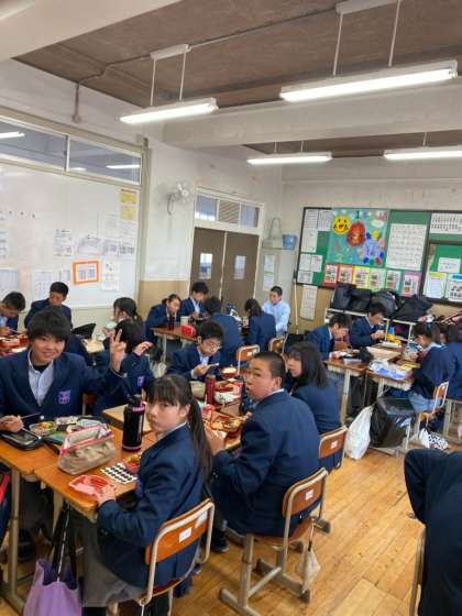 楽しい昼食の時間です。班ごとにおしゃべりしながら楽しいひと時を過ごしています。カメラを向けると恥ずかしくて顔をそむける人もいましたが・・・。昼食時間にお邪魔しました!