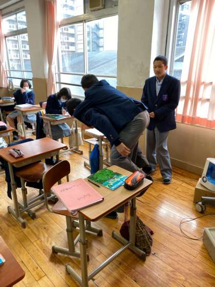 休み時間の様子です。授業と授業の間,ホット一息ついている人,次の英語の授業のパフォーマンステストの準備をしている人,さまざまです。