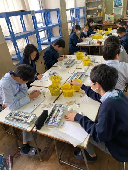 1年3組は美術の授業です。本物のしめじを見ながら,紙粘土と絵具でレプリカ?を作っています。本物と作り物と区別がつかないくらいに上手に作っています。