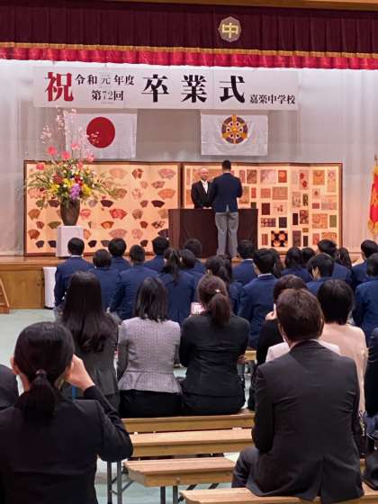 本来,在校生からの送辞を受け,卒業生の答辞を行う予定でしたが,時間短縮のため,答辞の代わりの「旅立ちの言葉」を読上げました。立派な振る舞いと,自然と涙が零れ落ちるような言葉で3年間の自分たちの成長をかみしめていました。卒業生59名の脳裏には3年間の思い出が走馬灯のように流れ,卒業生をはじめ,会場に参列する皆を感動に包み込む「旅立ちの言葉」でした。