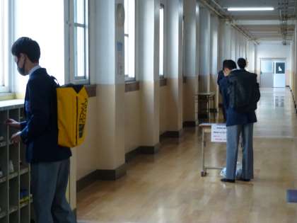登校した生徒は,各フロアに設置されている消毒液を手につけて教室へ入っていきます!手洗い・うがい・換気・3密(密閉・密集・密接を避ける)を意識して過ごしましょう!