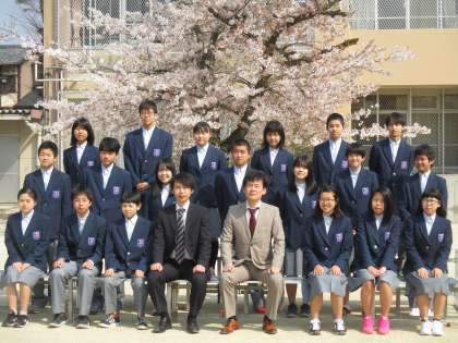 晴天の下,本日,本校グランド桜の木の下で学級写真を撮影しました。