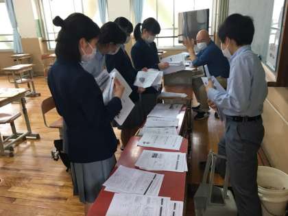本日,3年生各クラスを2つのグループに分けて8時30〜1時間,10時〜1時間。学習状況の確認と質問会を行いました。また,課題提出と同時に18日以降の課題も封筒に入れて配布しました。この課題は6月1日に提出してくださいね。
