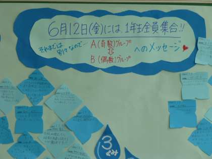 昨日に引き続き,1年生の心温まる掲示物を見つけました!6月1日から学校生活が再開されましたが,今週と来週はまだ分散(奇数グループと偶数グループ別)登校です。クラス,学年全員が集まるまで,もうしばらくの我慢・・ということで,奇数グループ,偶数グループの生徒からメッセージを集めました!花びらを模(かたど)ったメッセージカードは一つになり,各クラス,学年の大きな花を咲かせました!