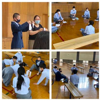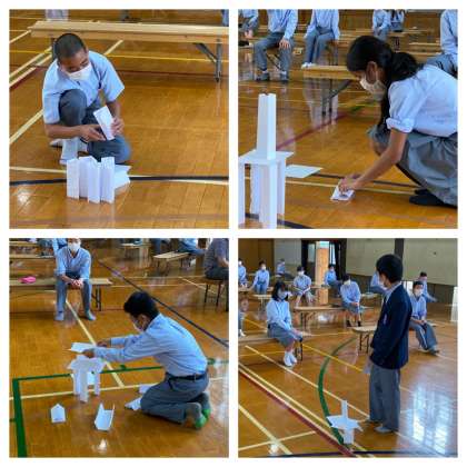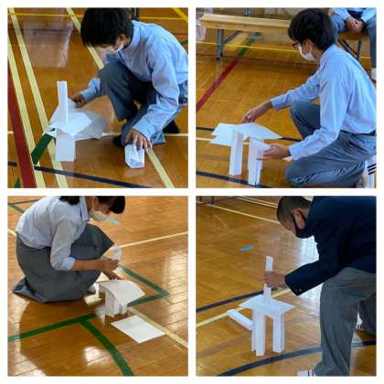 奇数グループに負けないアイディアで紙タワーを作っています。