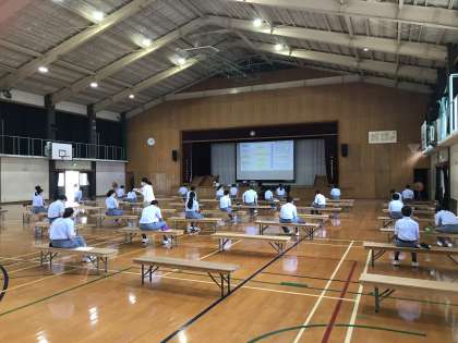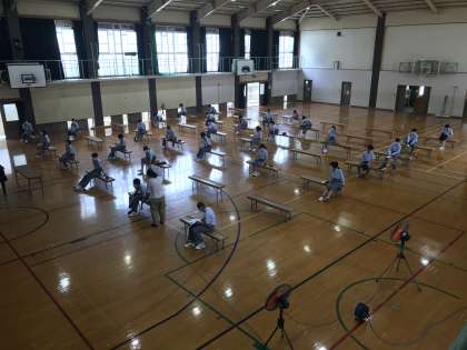 学年合同で体育館で授業を受けています。