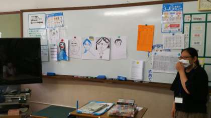 1組は美術に取り組んでいます。一筆で自画像を描くという難易度が高そうですが,上手に仕上がっていました。授業にお邪魔した私の似顔絵を,一筆書きにしてもらいました。ありがとうございます。