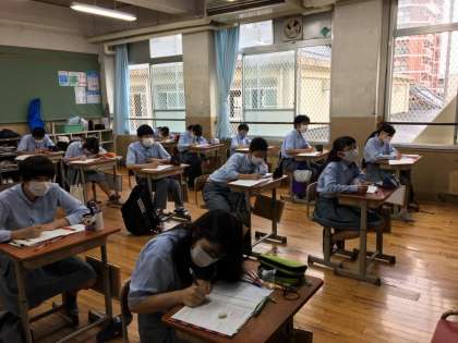 理科や数学の授業では少し距離を置いて教え合い活動を行っていました。