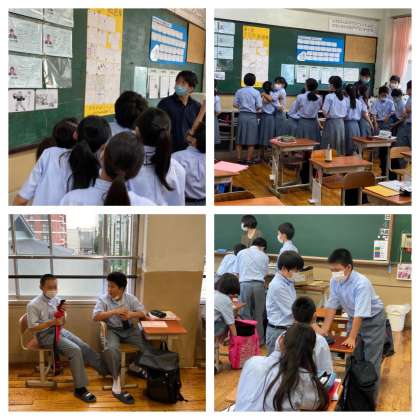 4組では、各自が描いてきた学級旗デザインが貼り出され、皆歓声をあげながら作品を見ています。