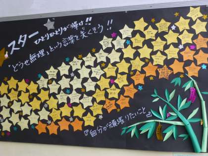 1年生のフロア(3階)に上がる階段に,七夕飾り&天の川をイメージした掲示物を見つけました!『スター ひとりひとりが輝け!!「どうせ無理!」という言葉を失くそう!』というフレーズが書かれていました。今週火曜日の道徳の時間に取り組んだ際,みんなが「今,自分が頑張りたいこと」を書いてくれました。星形の用紙に書いたみんなの思いが,模造紙いっぱいに飾られていて,とってもかわいい掲示物に仕上がっていました。「どうせ無理!」ではなく,いつも前向きに目標に向かって取り組んでいく,そんな学年にしていってくださいね!